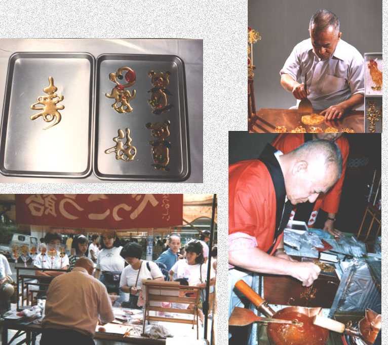 縁日でよく見られる形べっ甲飴(型の中に飴を流し込んで作る)とは